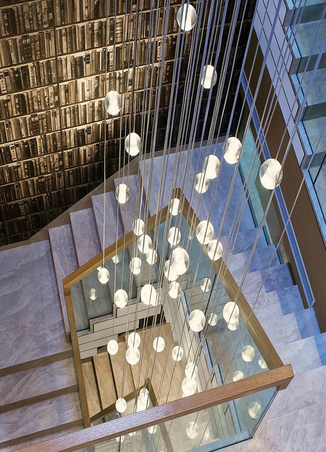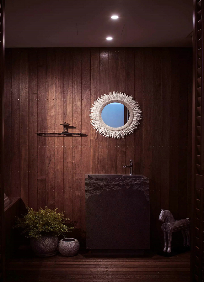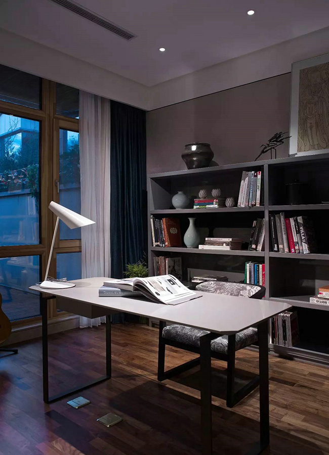 【設(shè)計理念】:本案例客廳、餐廳、樓梯間等公共區(qū)域均以新中式為主題,以黑色木質(zhì)結(jié)構(gòu)配以灰木紋石材飾面,將現(xiàn)代人對吳文化的理解貫穿始終,讓人如置風雅吳地的畫卷之中。